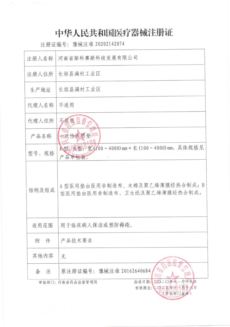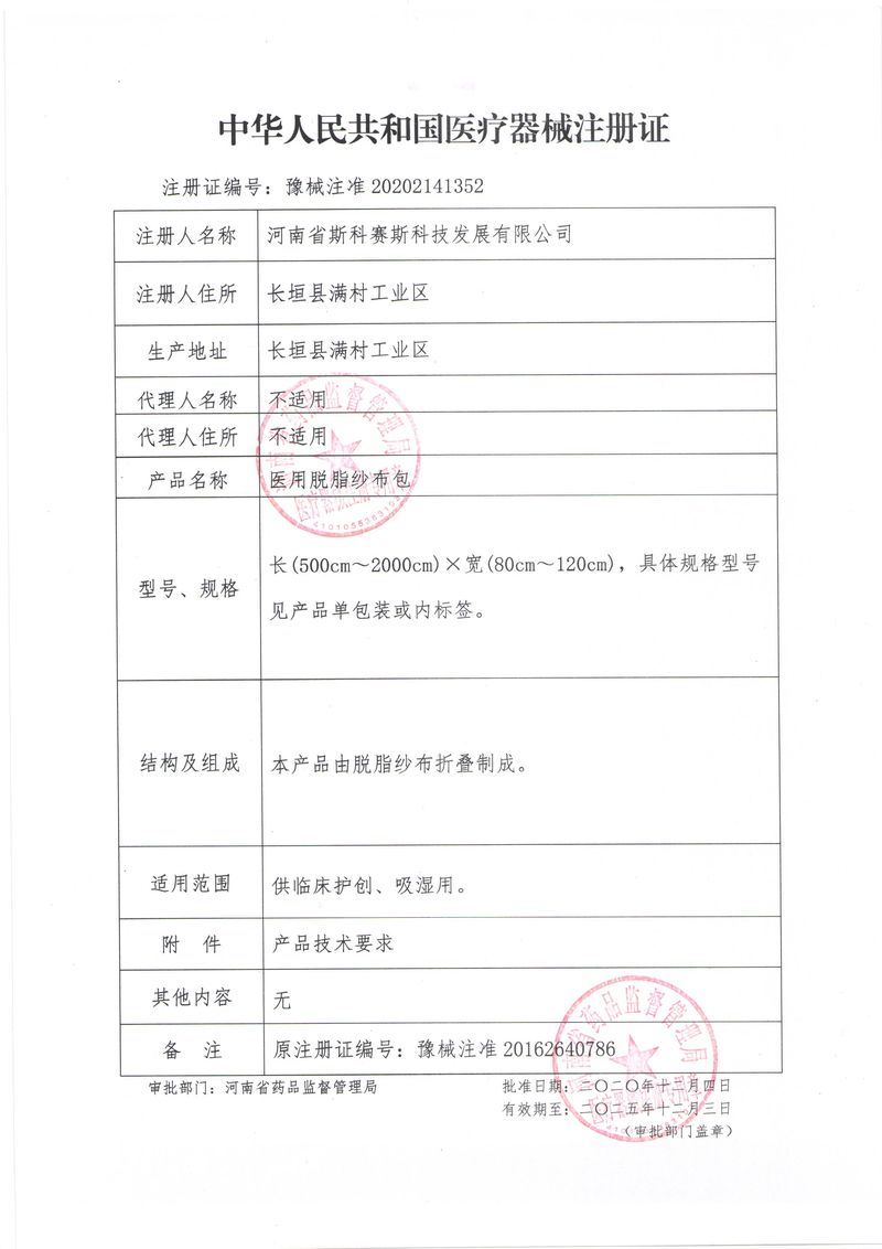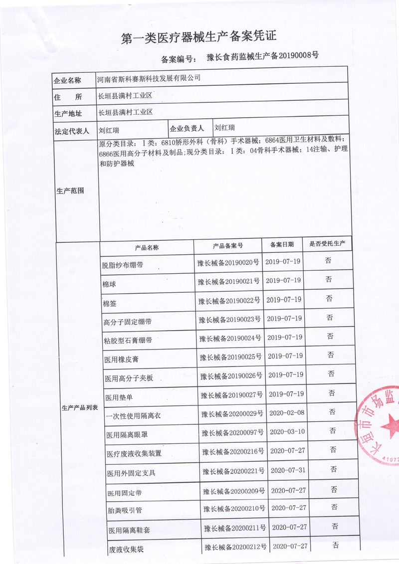河南省斯科賽斯科技發(fā)展有限公司創(chuàng)建于 2011 年,位于“中國醫療耗材之都”- 河南省長垣縣,西臨 308 省道,南靠新菏鐵路,北依長濟高速,交通便捷,經濟發(fā)達,環(huán)境優(yōu)美。斯科賽斯積極進入醫療健康和服務領域,秉承為用戶創(chuàng)造價值的理念,專注于醫用耗材解決方案的研發(fā)和運營,并為用戶提供完善的產品解決方案;  斯科賽斯主要生產醫用麻醉系列、醫用高分子系列、醫用敷料包系列、醫用無紡布系列、醫用防護系列、醫用脫脂棉系列、生物材料制品類等七大類、100 多個品種、400 多個規(guī)格的產品。公司占地面積約 30000 平方米,建筑面積20000 平方米,擁有 10 萬級的凈化車間總面積 10000 平方米。擁有國際先進水平的生產設備和檢測儀器,技術裝備精良,檢測手段完善,為醫療行業的不斷發(fā)展進步提供保障。公司順利通過 ISO9001、ISO13485 質量管理體系認證。  斯科賽斯堅持研發(fā)高科技新產品,力爭在醫療器械關鍵領域取得技術和研發(fā)的重大突破;立足國內和國際兩個市場,逐步實現管理理念、經營機制、人力資源、技術、產品、市場等全方位對接,提高企業的核心競爭力;過去的歲月里,斯科賽斯砥礪前行,誠信務實,銳意進取,不斷創(chuàng)新,用自己的睿智和辛勞,以富有責任感的使命,在探索中追求,在追求中超越,致力于成為值得信賴的醫療用品生產企業!在未來的日子里,斯科賽斯將一如既往豪情滿懷,信心百倍,攜手并肩,執(zhí)著追求,向更高的的目標前進,鑄造新的輝煌!